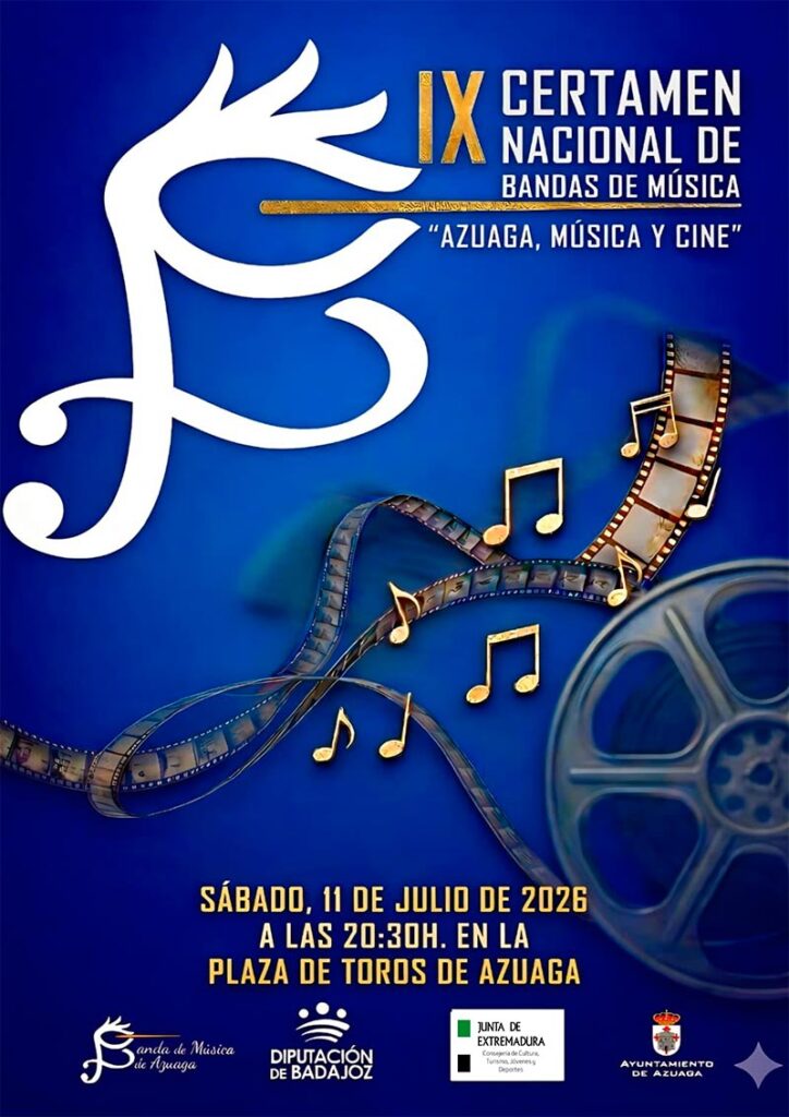 La Asociación Banda de Música de Azuaga, en colaboración con la Concejalía del Ayuntamiento de Azuaga, convoca para este año 2026 el IX Certamen Nacional de Bandas de Música “Azuaga, Música y Cine”, que tendrá lugar el sábado 11 de julio de 2026 a las 20:30 horas en la Plaza de Toros de Azuaga.